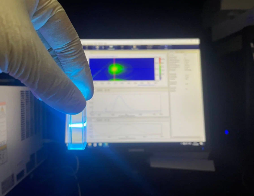 Эти частицы при облучении ультрафиолетом испускают синее свечение (люминесцируют), при этом его интенсивность и оттенок (спектр) меняются в зависимости от того, какие ионы и в каком количестве находятся в растворе. Ученые приготовили 7 813 вариантов растворов с разными комбинациями и концентрациями ионов никеля, меди, кобальта, свинца, алюминия, хрома и нитрат-анионов. В растворы добавили углеродные точки и зарегистрировали спектры свечения.