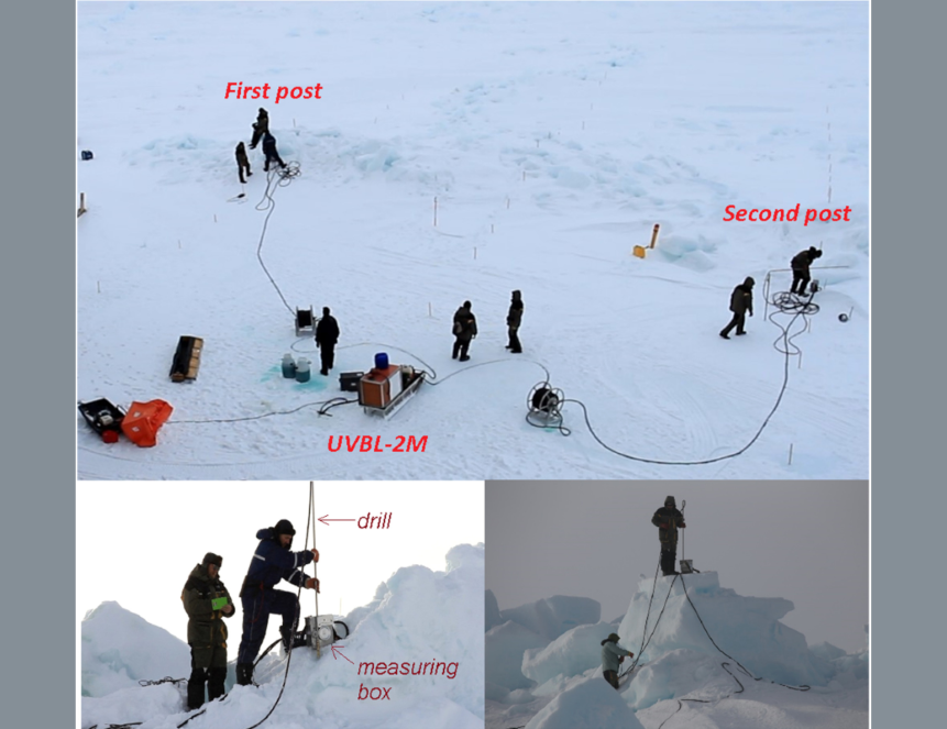 Чтобы изучить внутреннюю структуру торосистых образований в полевых условиях, авторы использовали технологию водяного термобурения, разработанную сотрудниками Арктического и антарктического научно-исследовательского института. Бурение проводили с использованием морской воды, подогретой в котле до 80°С и подаваемой под давлением по подводящим шлангам к буровым постам. При этом скорость бурения автоматически регистрировали на цифровой носитель. Это позволило выявлять в скважинах границы полостей и слоев льда разной плотности, а также надежно определять границы и толщину ключевой характеристики для расчета ледовых нагрузок — консолидированного слоя торосистого образования.